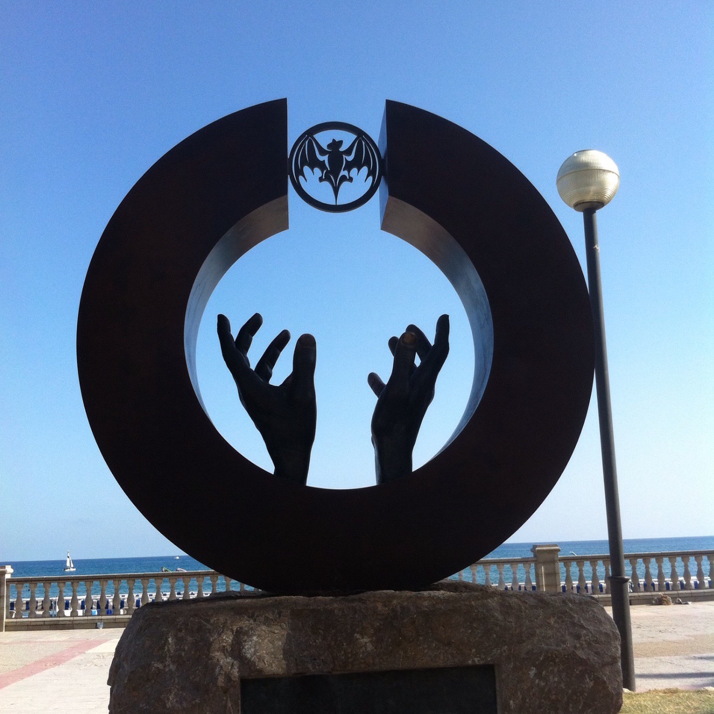 Het beeld van Bacardi vind je op de boulevard recht tegen over het straatje waar alle barretjes naast elkaar zitten,Calle de Pecado, vrij vertaald de straat der zonde.